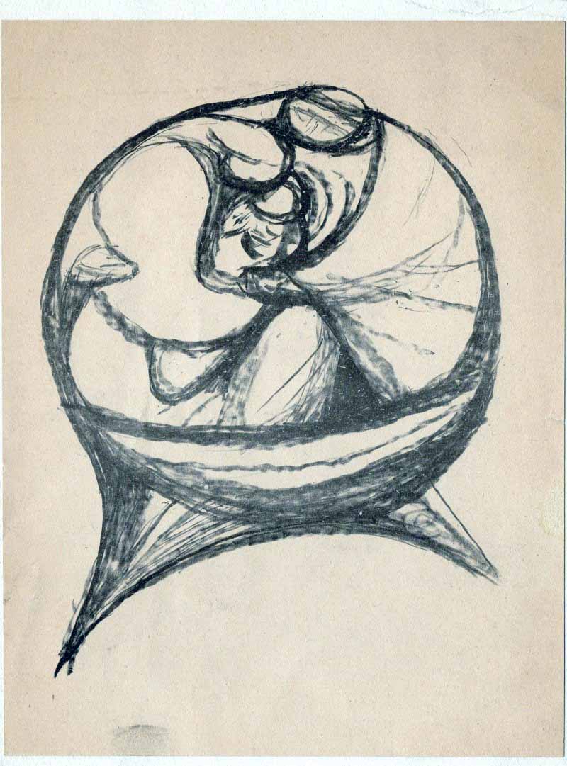 Entstanden: 1956. Grußkarte zur Weihnacht: 1957. Druck von Kohlezeichnung. In Skizzenbuch 1. Ein weiterer Druck mit Weihnachtsgruß auf der Rückseite des Passepartous