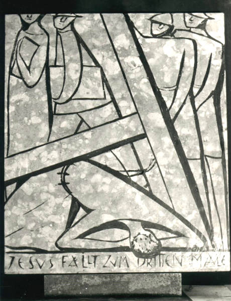Entstanden um 1965. Kreuzwegszene: Ein Mensch fällt, geschäftige Leute gehen teilnahmslos vorbei, die Aktenmappe unter dem Arm.