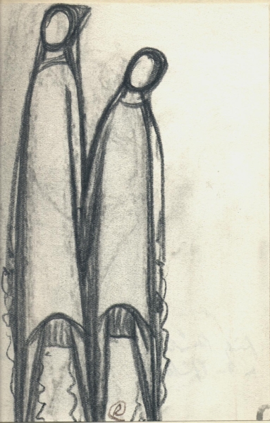 Entstanden um 1960. In Skizzenbuch 2: gebundenes Buch (29x20 cm), vorwiegend sind die Zeichnungen eingeklebt, teilweise auch ins Buch gezeichnet.