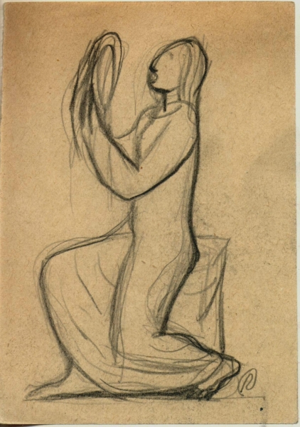 Entstanden um 1954. In Skizzenbuch 1: gebundenes Buch (24x20 cm), vorwiegend sind die Zeichnungen eingeklebt, teilweise auch ins Buch gezeichnet.