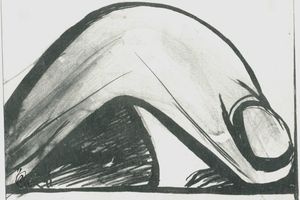 Der Typus des Rauschhuber´schen Menschenbildes, der die Schattenseite des Lebens verkörpert, ist der „Leidende“. Zum Teil erinnern diese leidenden Gestalten sowohl in der Thematik als auch in der formalen Ausgestaltung an jene von Käthe Kollwitz und Ernst Barlach. In den späteren Werken findet Luis Rauschhuber dann zu einer abstrakteren Formensprache, so, um ein Beispiel zu nennen, in einer Zeichnung von 1966 (siehe Abbildung unten), – hier wird der Ausdruck des Leidens auf die Gestik des Krümmens reduziert, die durch zwei kraftvolle, auf Grund ihrer Parallelität sich verstärkenden Linien veranschaulicht wird. Durch die Betonung der rechten unteren Bildecke entsteht der Eindruck eines Dahingeworfenwerdens. Es wird damit das Ausgeliefertsein eines jeden Menschen seinem Schicksal gegenüber angesprochen. Die Gestalt wird an zwei Seiten vom Bildrand überschnitten, ein Kompositionsmittel, das die Macht und Stärke des Erlebnisses betont.